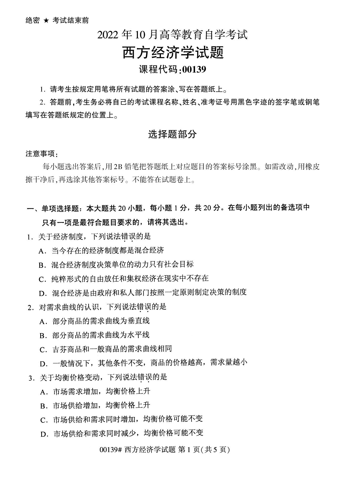 所在位置:安徽自考服务网 > 安徽自考试题题库 > 安徽自考历年真题 > 2022年10月高等教育自学考试西方经济学00139试题