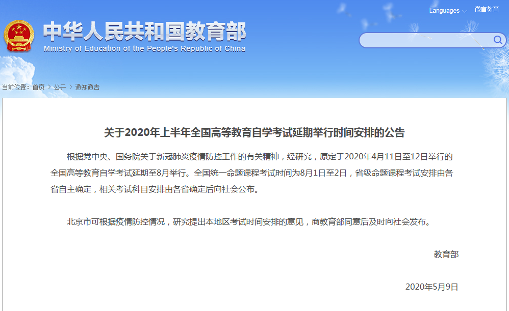 根据党中央、国务院关于新冠肺炎疫情防控工作的有关精神,经研究,原定于2020年4月11日至12日举行的全国高等教育自学考试延期至8月举行。全国统一命题课程考试时间为8月1日至2日,省级命题课程考试安排由各省自主确定,相关考试科目安排由各省确定后向社会公布